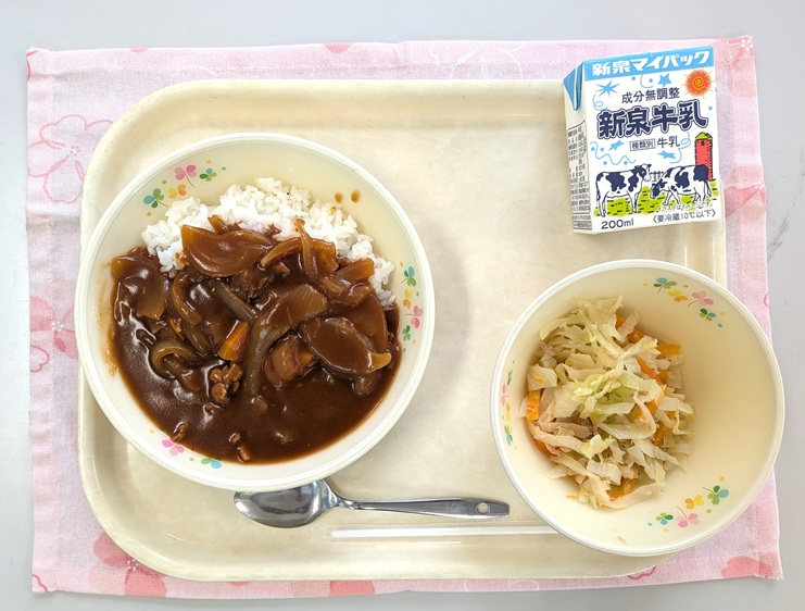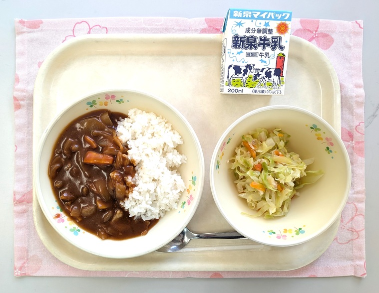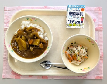 今日の献立は、カレーライス、大根サラダ、牛乳です。