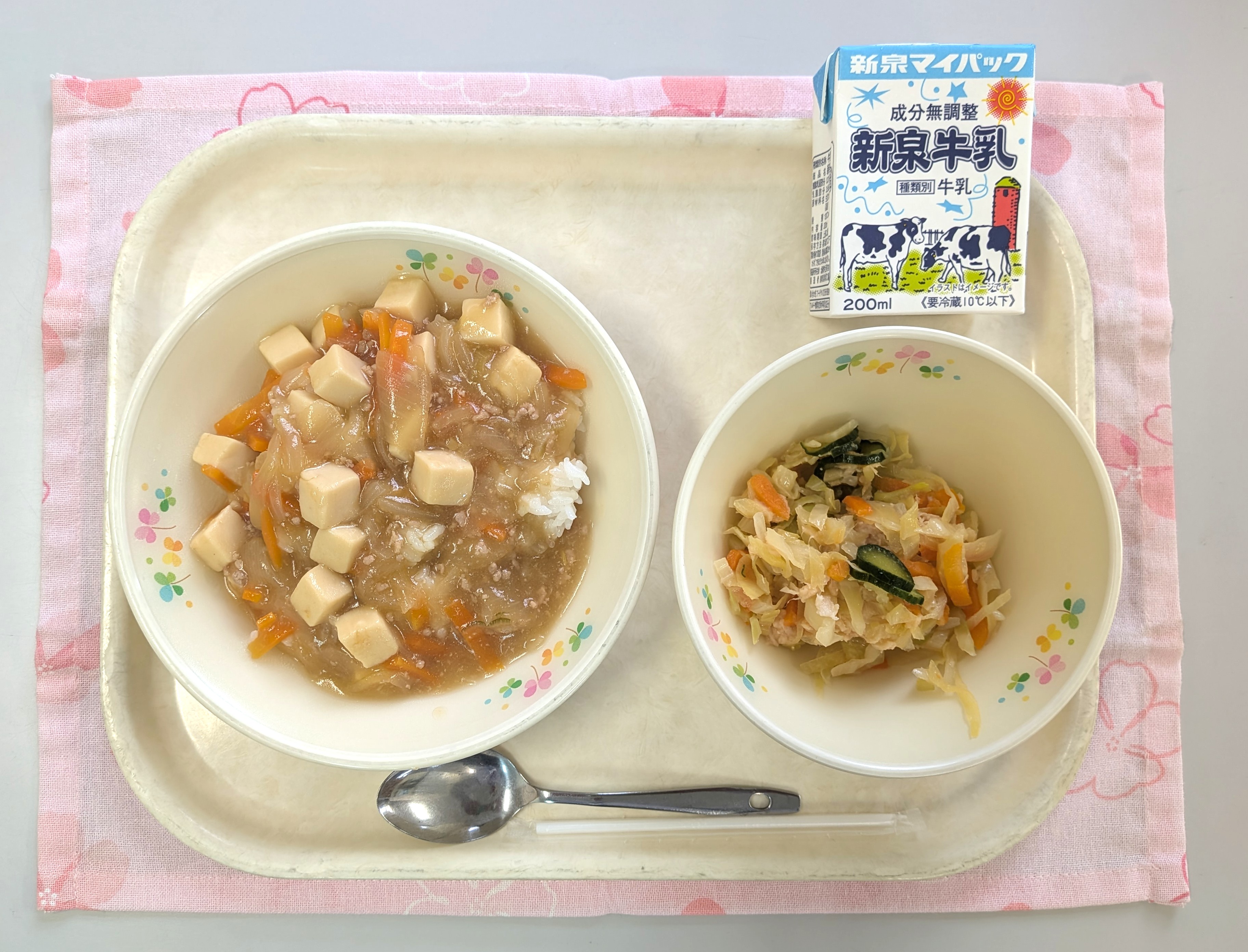 今日の献立は、麻婆豆腐丼、キャベツときゅうりのさっぱり和え、牛乳です。