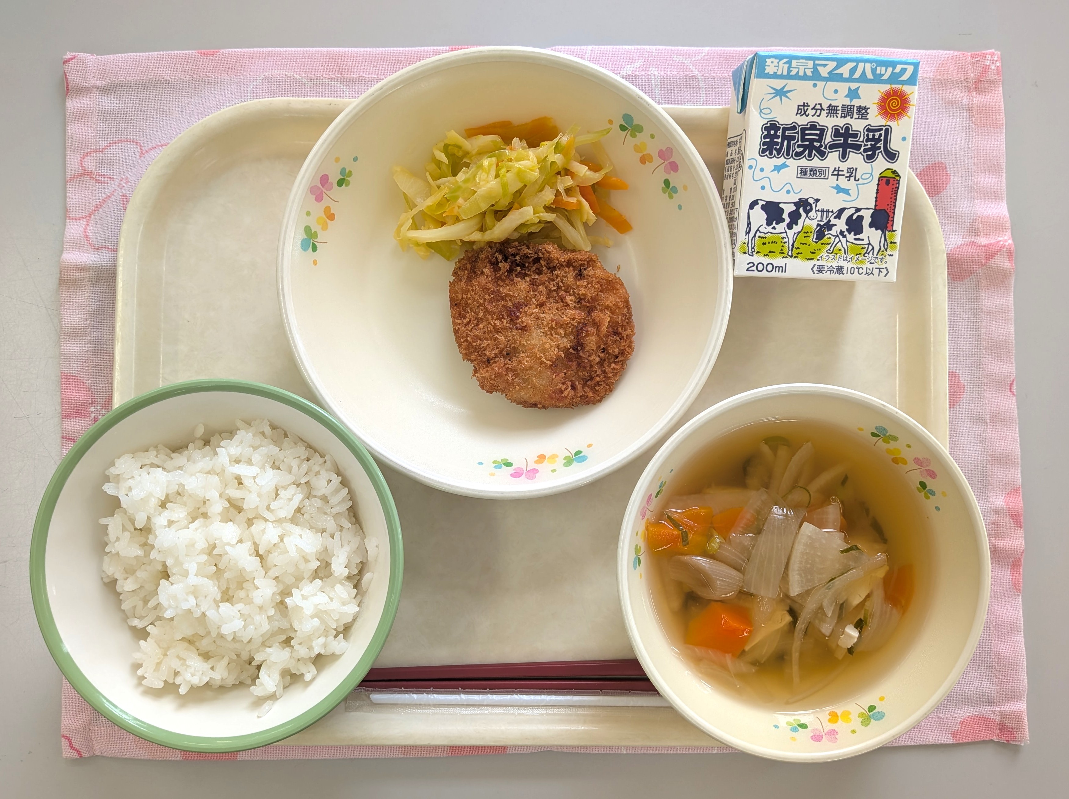 今日の献立は、ごはん、メンチカツ、ゆかりあえ、わかめのみそ汁、牛乳です。