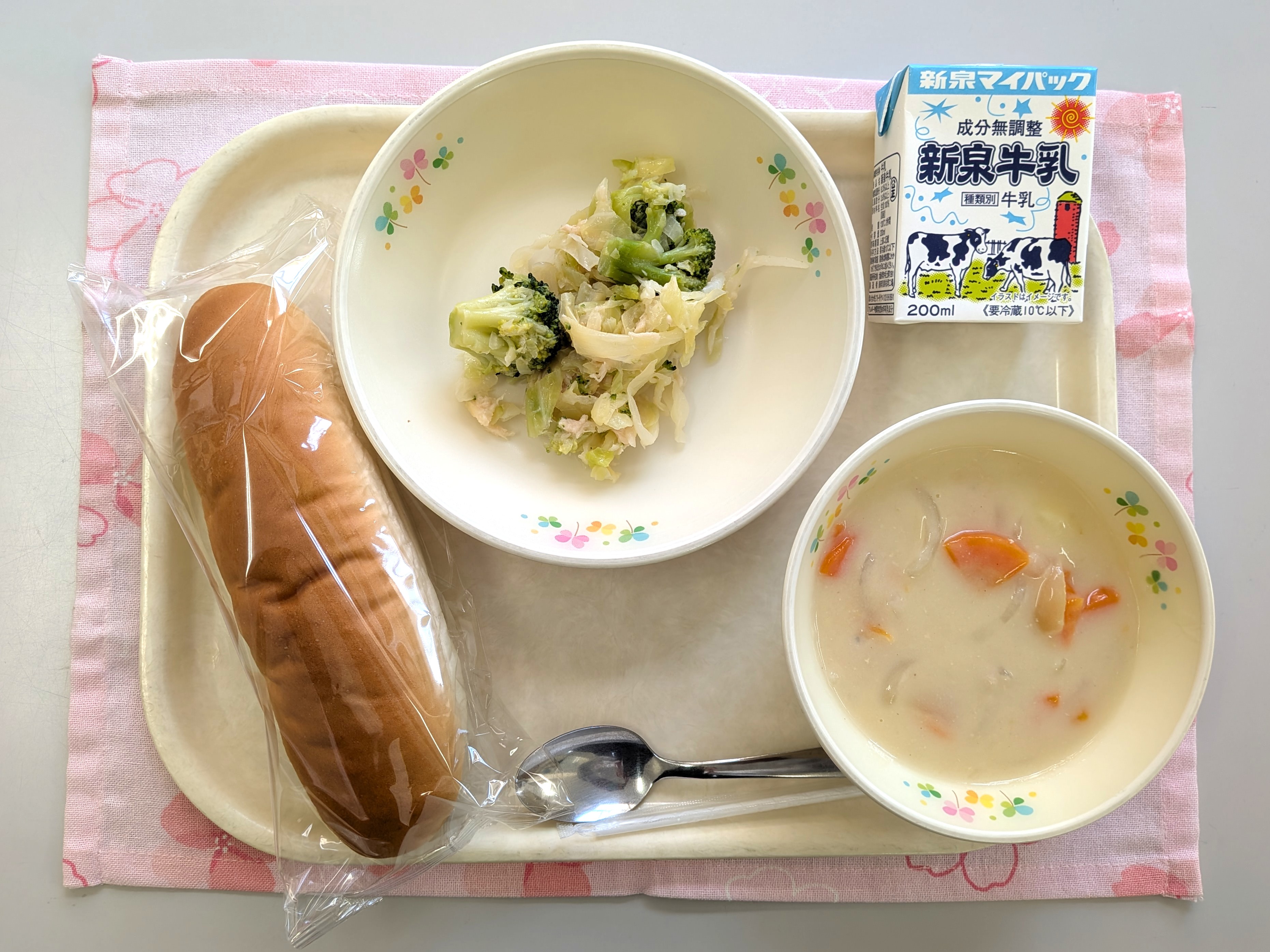 今日の献立は、県産小麦のコッペパン、ポトフ、ブロッコリーのチーズサラダ、牛乳です。