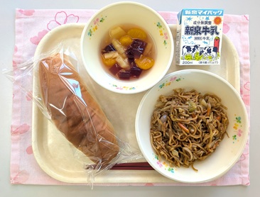今日の献立は、パン、ソース焼きそば、ゼリーポンチ、牛乳です。