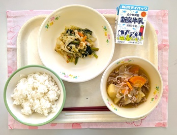 今日の献立は、ごはん、豚じゃが、おかか和え、牛乳です。