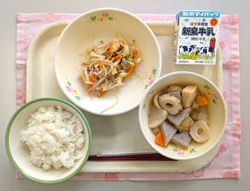 今日の献立は、ごはん、揚げじゃがのそぼろあん、けの汁、牛乳です。