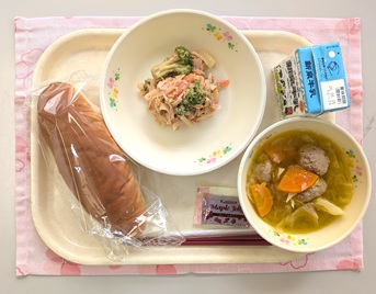 今日の献立は、パン、肉だんごの豆乳煮、柚子ドレッシングサラダ、牛乳です。