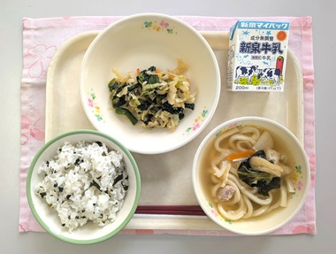 今日の献立は、わかめごはん、うどんすき、変わりおひたし、牛乳です。