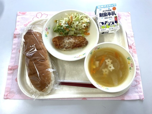 今日の献立は、パン、コロッケ、カレー風味のキャベツ、ABCマカロニスープ、牛乳です。