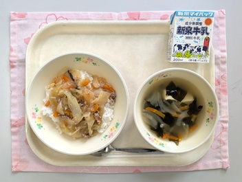 今日の献立は、わかめごはん、かやくうどん、ごま和え、牛乳です。