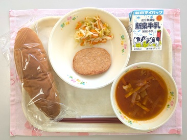 今日の献立は、パン、ボロニアステーキ、キャベツのマリネ、ミネストローネ、牛乳です。
