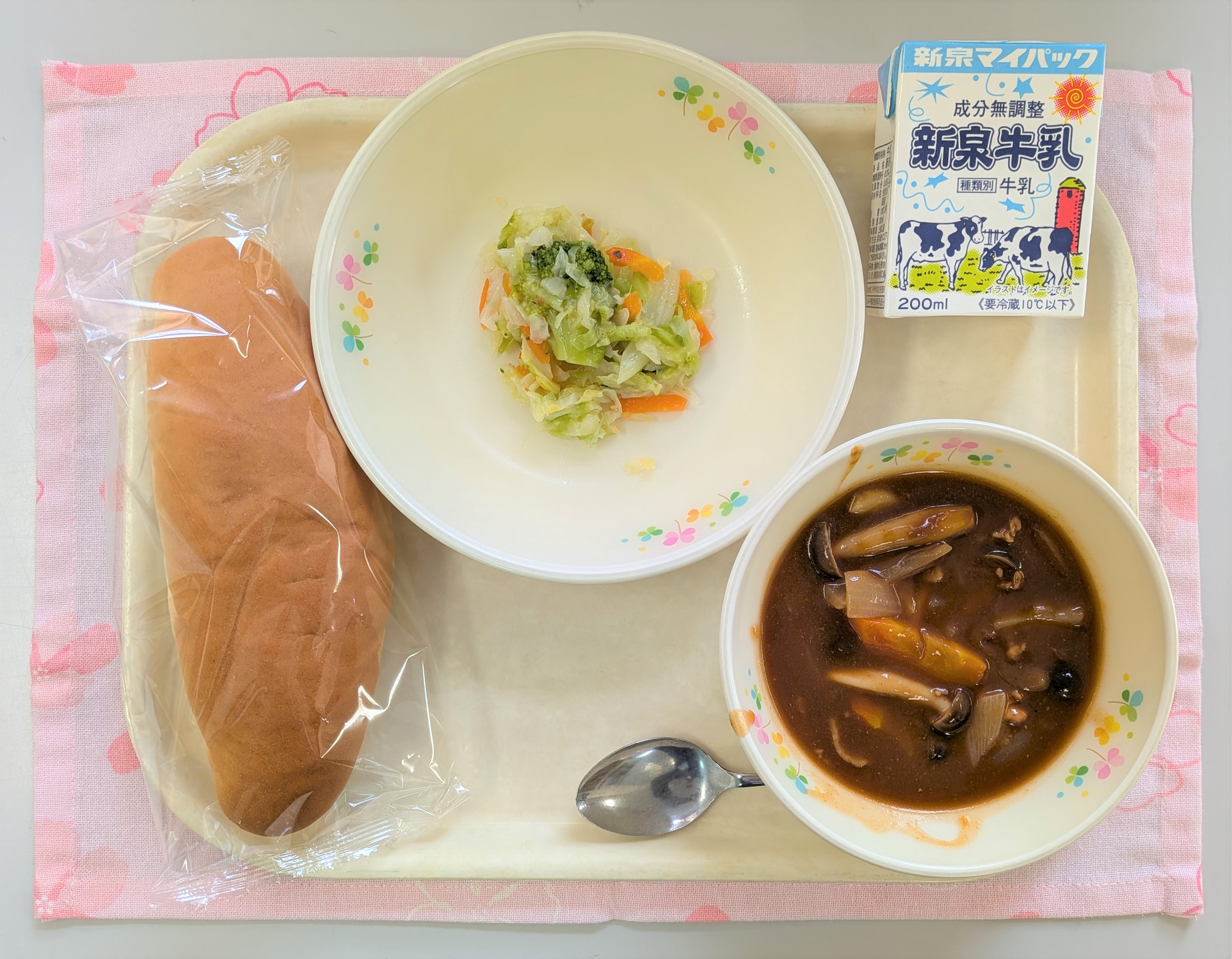 今日の献立は、パン、ブラウンシチュー、イタリアンサラダ、牛乳です。