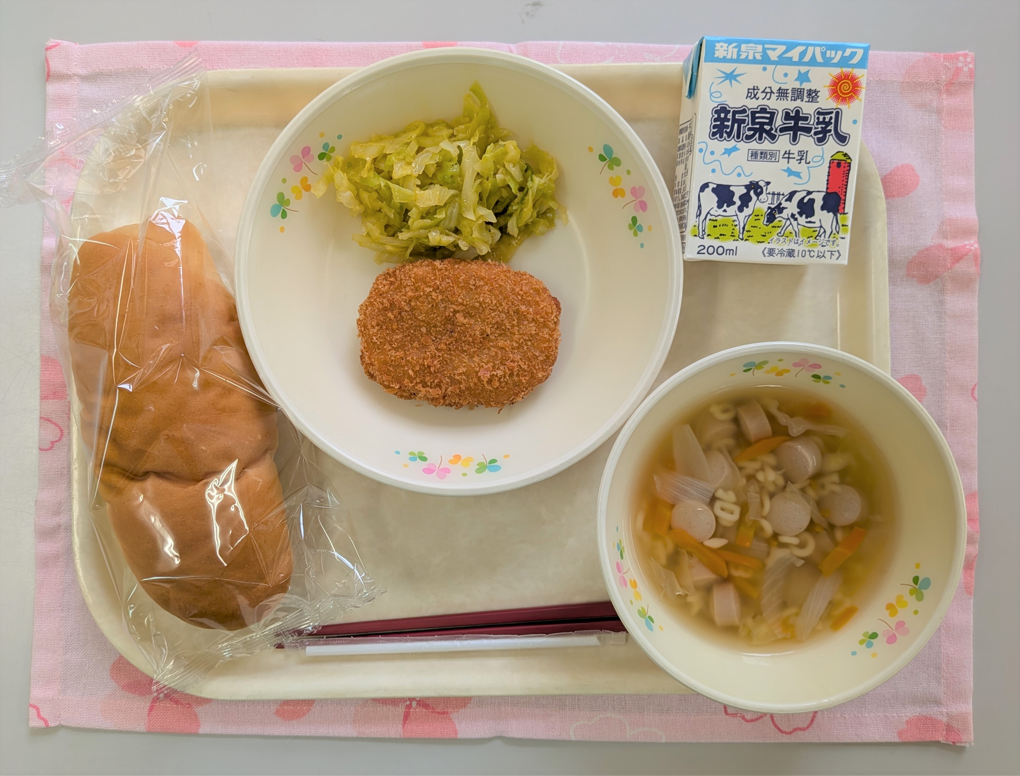 今日の献立は、パン、コロッケ、カレー風味のキャベツ、ABCマカロニスープ、牛乳です。