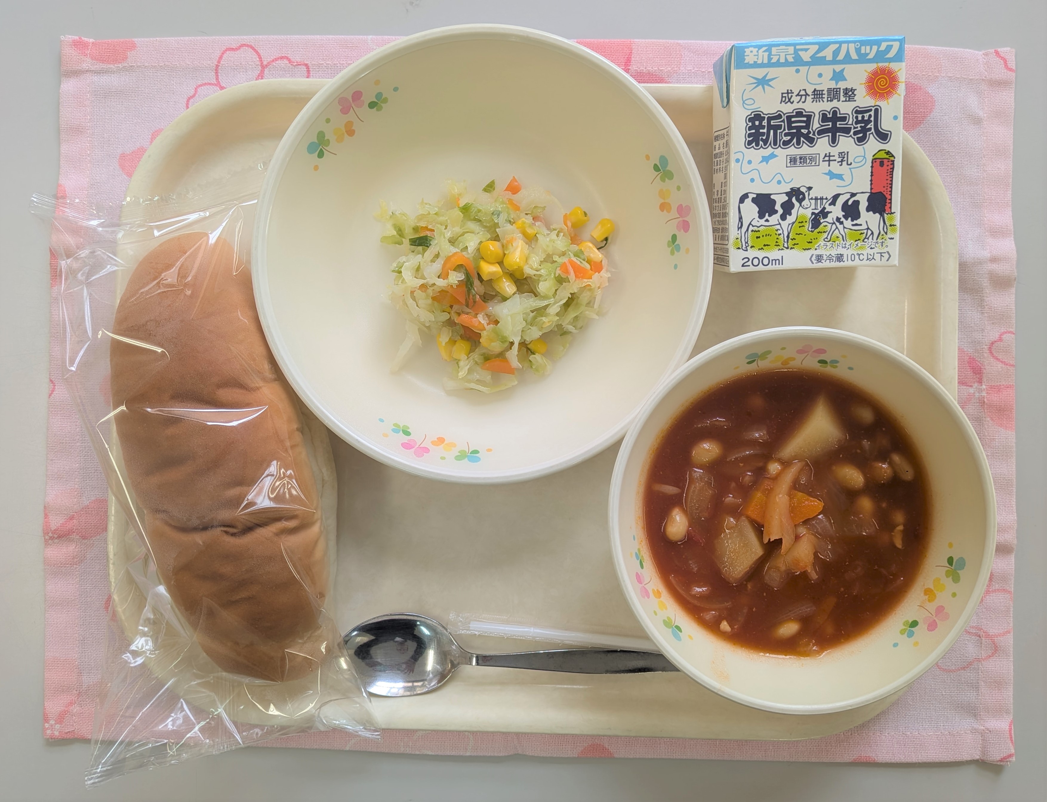 今日の献立は、パン、さつまいものポトフ、オーロラサラダ、牛乳です。