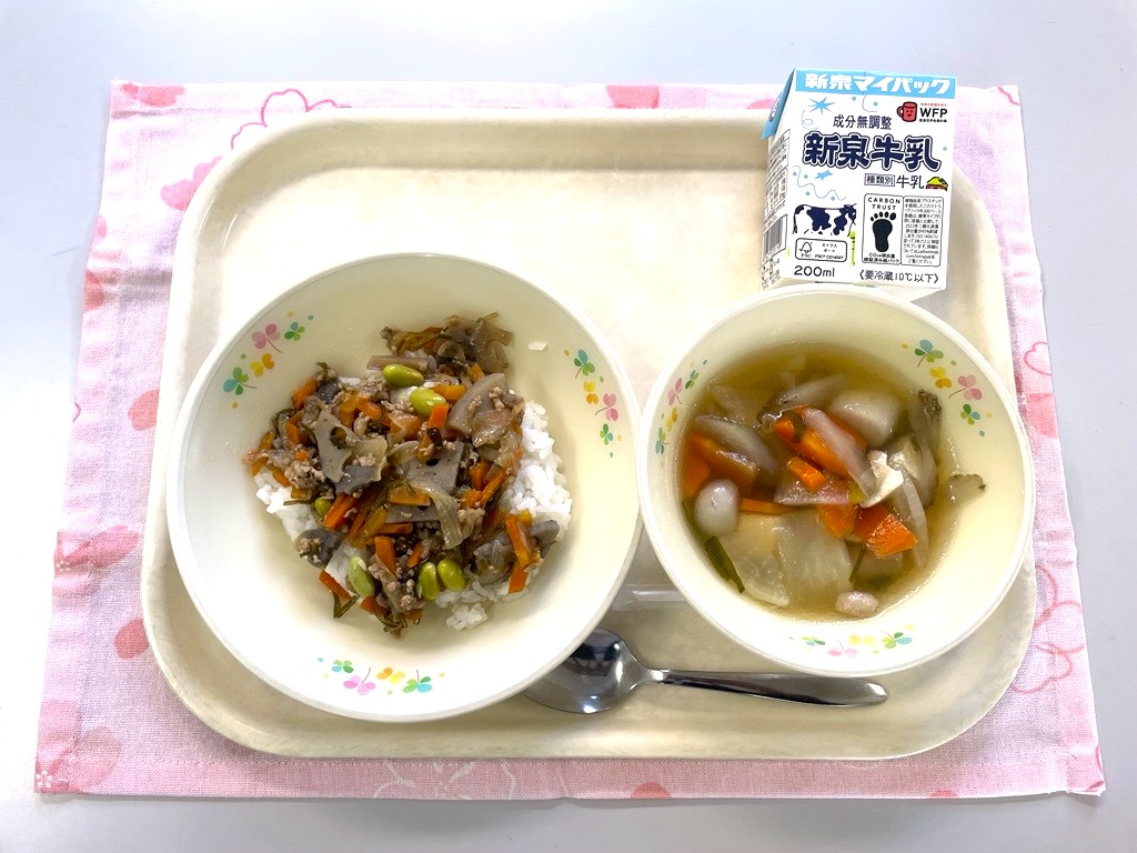 今日の献立は、細切り昆布のそぼろごはん、けんちん汁、牛乳です。