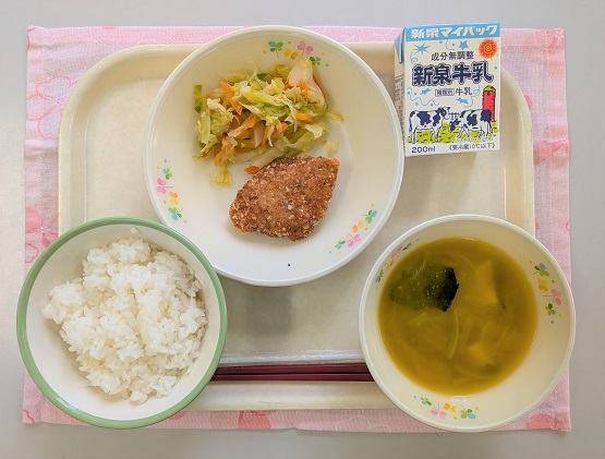 今日の献立は、ごはん、ささみカツ、野菜ソテー、かぼちゃのみそ汁、牛乳です。
