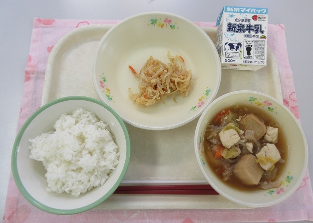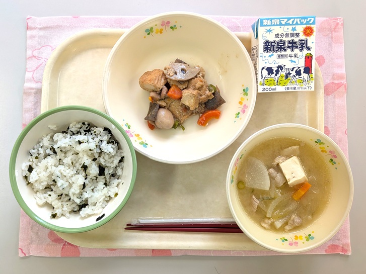今日の献立は、わかめごはん、筑前煮、豚汁、牛乳です。
