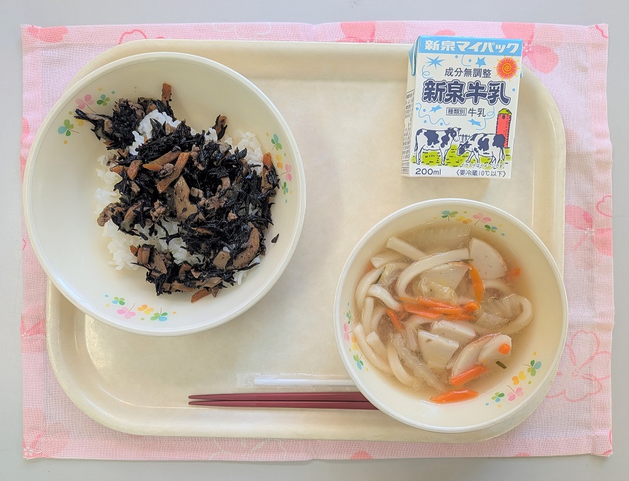 今日の献立は、セルフひじきごはん、あんかけうどん、牛乳です。【新献立】