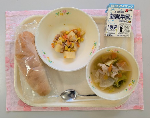 今日の献立は、県産小麦のコッペパン、ポトフ、ブロッコリーのチーズサラダ、牛乳です。