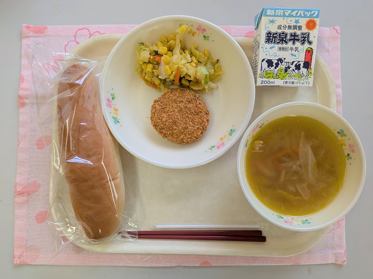 今日の献立は、パン、メンチカツ、三色ソテー、オニオンスープ、牛乳です。